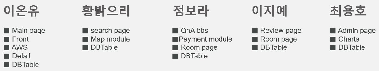 나는 게시판 하나와 결제 모듈, 방 등록 페이지를 담당하여 진행하게 되었다. 주로 backend단을 맡아 진행하였는데 프론트 ui에서 이어지는 동작을 내가 연동되게 짜야했고 프론트를 맡은 분과 요청을 맞춰야했기 때문에 함께 협업해서 했다. 내가 프론트와 백이 요청을 주고 받을 수 있도록 로직을 짜고 프론트 분이 퍼블리싱을 입히고 수정사항을 건의하는 방식이었다.